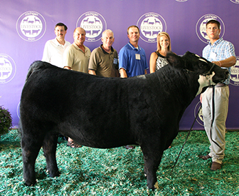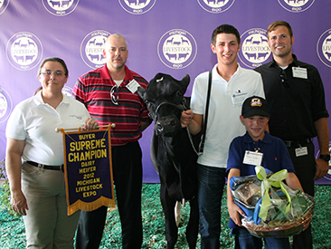 The 1,302-pound grand champion market steer raised by Ben Ross of Lawrence was purchased by Meijer, Inc. at the 2012 Michigan Livestock Expo, July 17 in East Lansing. Pictured (from left) are Meijer representatives Daniel Bruinsma and Tommy Suter; Lt. Gov. Brian Calley; Jerry Suter and Brian Scanlon of Meijer; and Ben Ross. |