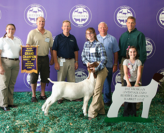 The 82-pound grand champion market goat raised by Cailyn Hines of Quincy was purchased by GreenStone Farm Credit Services and Michigan State University Federal Credit Union (MSUFCU) at the 2012 Michigan Livestock Expo, July 17 in East Lansing. Pictured (from left) are Payton Hines; Paul Anderson and Steve Junglas of GreenStone; Pat McPharlin of MSUFCU; Cailyn Hines; Jeff Jackson of MSUFCU and Michigan Department of Agriculture and Rural Development Director Jamie Clover Adams. |